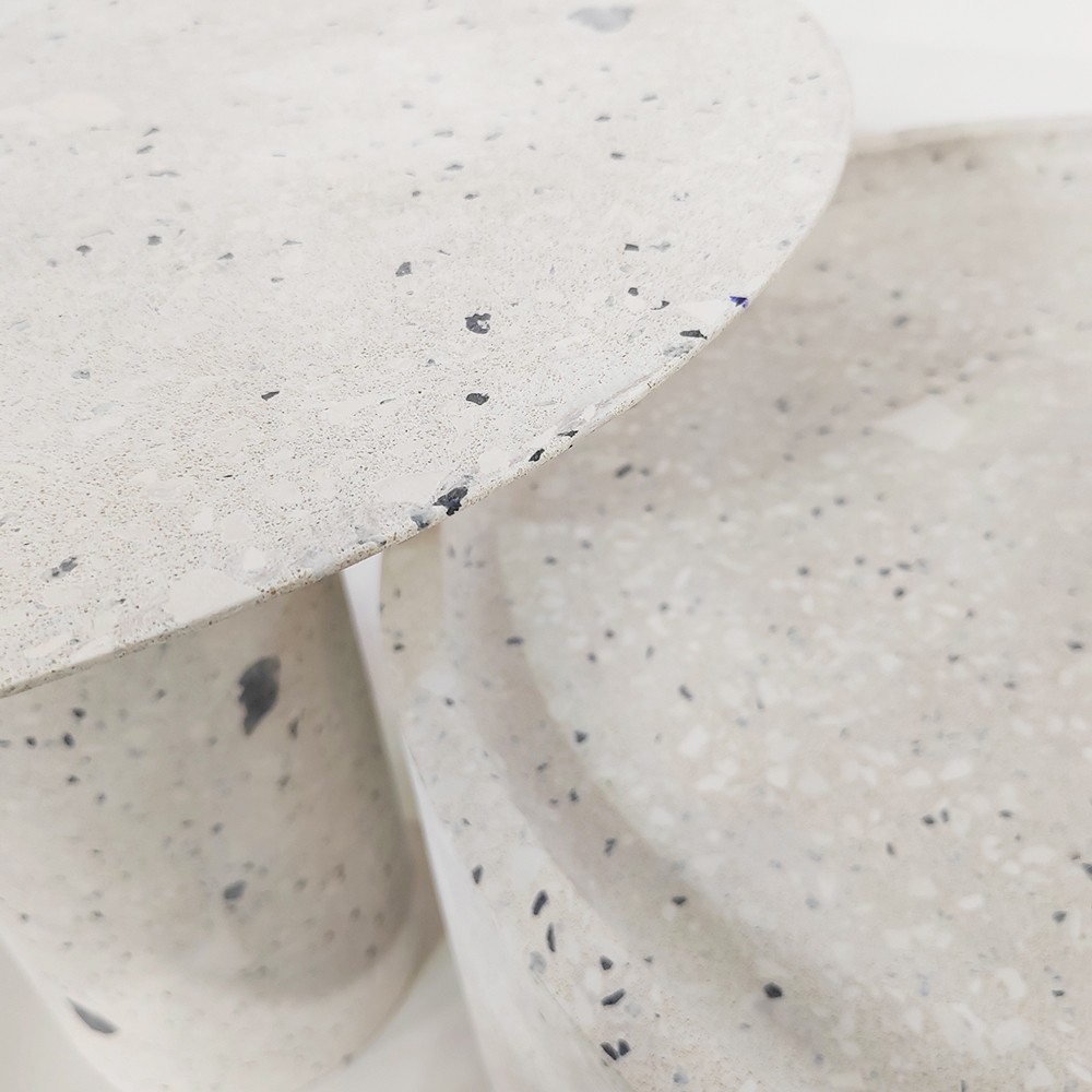 - Универсальная функциональность: журнальные столики Terrazzo можно использовать в различных помещениях, включая гостиные, офисы и даже открытые пространства. Они служат как функциональной поверхностью для размещения напитков и других предметов, так и декоративным элементом.